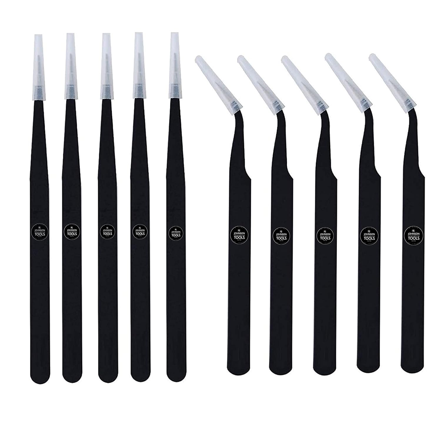 Johnson Tools Non Magnetic Stainless Steel Straight and Curved Tips Tweezers for Mobile, Gadget, Laptop and Jewelry Repair (Black) - Set of 10 Pieces