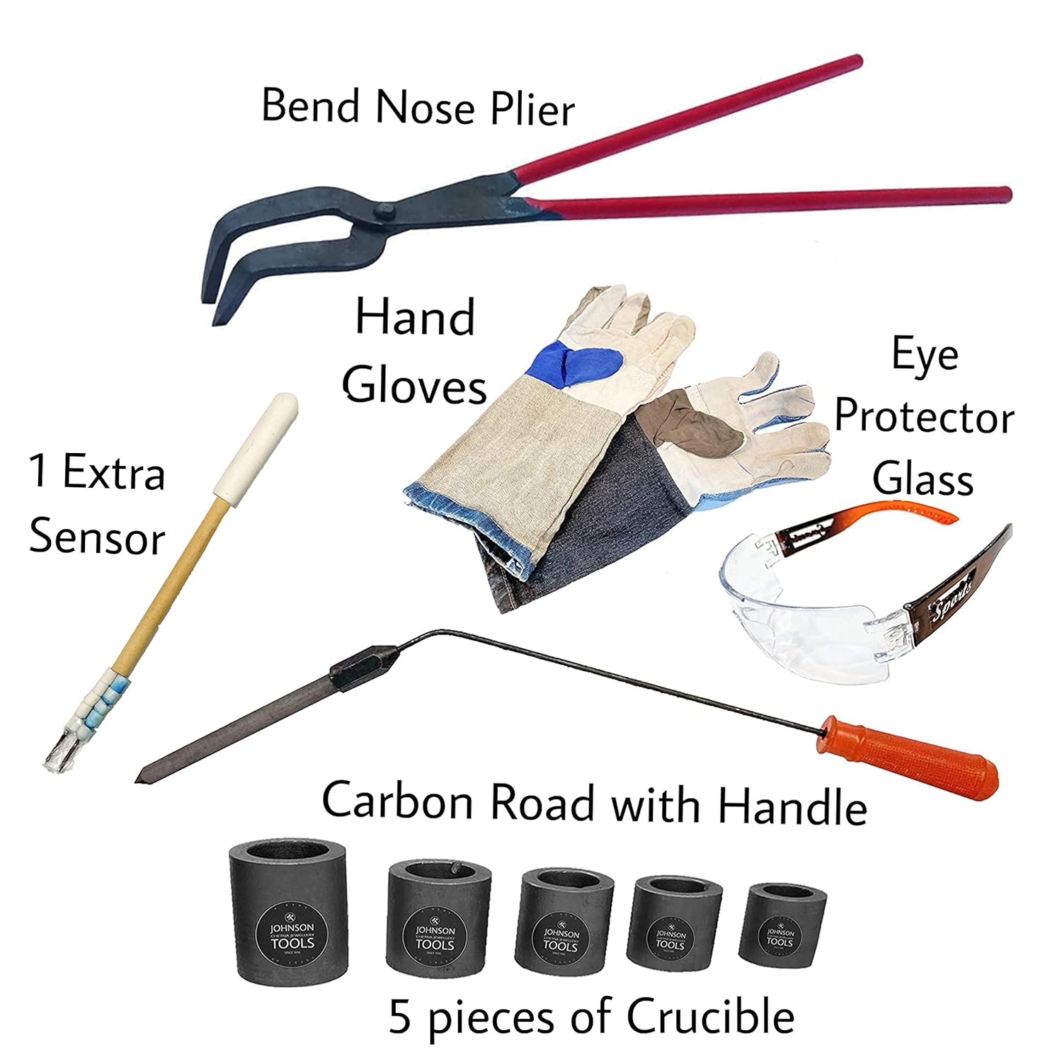 - Include Five Crucible, One Carbon Rod, One Rod Handle, One Extra Sensor, One Eye protect Glass, One Plier and Hand Gloves. If You Purchase this furnace, than see from below the furnace, All accessories will be there. (Color of the Furnace may Change, Based on Availability)